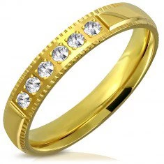 Prsten z oceli ve zlatém barevném - ozdobné hrany, šest zirkonků, > varianta 54