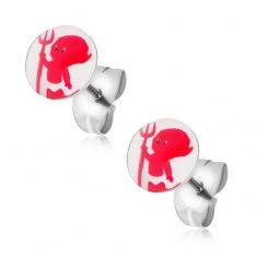 Náušnice z chirurgické oceli s puzetovým zapínáním mají v kulaté hlavičce transparentní glazurou zalitý obrázek červeného ďáblíka s vidlemi na pozadí bílé barvy. Průměr: 7 mm