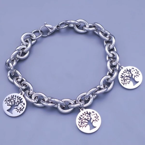 Dámský náramek z leštěné chirurgické oceli je zdobený přívesky se symbolem strom života. Šířka náramku 9mm. Velikost přívěsků 15mm Délka 20cm 463c