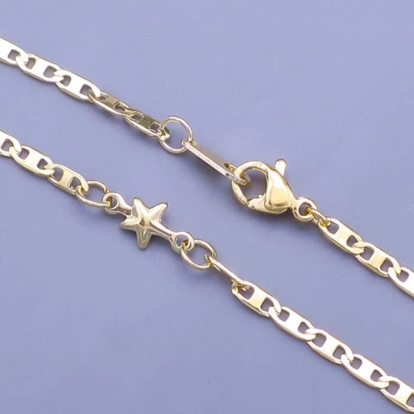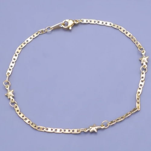 Dámský zlacený náramek z leštěné chirurgické oceli je zdoben třemi hvězdičkami o velikosti 6x5mm. Náramek je zlacen v ČR, 14kar. zlatem bez niklu Šířka řetízku 2mm. Délka na výběr od 16-17-18-19-20-21-22cm ZN07