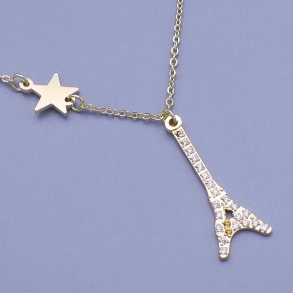 Přívěsek z chirurgické oceli Eiffelova věž je zdobená čirými zirkony. Povrchová úprava zlacení 14kar. v ČR. Odstín českého zlata bez niklu. Velikost 22x8mm Součásti přívěsku je zlacený řetízek z chirurgické oceli o šířce 1mm. Délka na výběr 40cm, 45cm. 2430