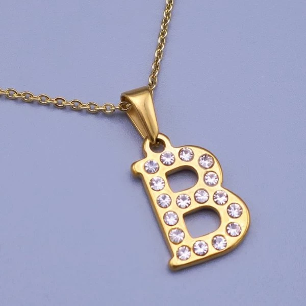 Písmeno B z chirurgické oceli je zdobeno čirými zirkony. Velikost 16x12mm Přívěsek je povrchově upraven zlacením. Součástí přívěsku je řetízek o šířce 1,2mm, který si můžete vybrat z délek od 40-45-50-55-60cm 1379