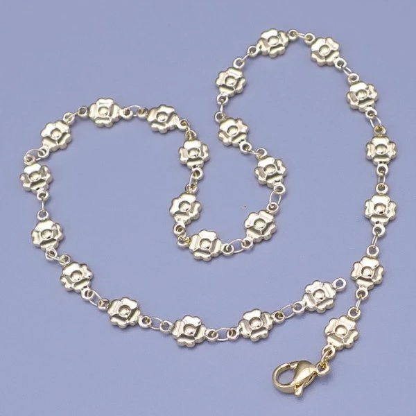 Náramek na kotník z chirurgické oceli je složený z oboustranných kytiček o velikosti 5mm. Povrchová úprava zlacení 14kar. V ČR v odstínu českého zlata bez niklu. Šířka 5mm Délka nastavitelná do 28cm K náramku na kotník nabízíme také náramek na ruku a řetízek. NH066