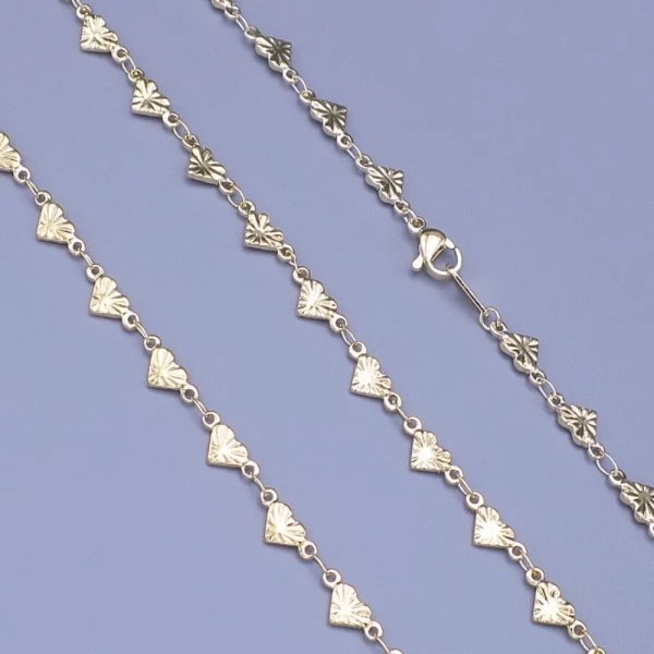 Řetízek z chirurgické oceli je složený z oboustranných srdíček o velikosti 6x5mm. Povrchová úprava zlacení 14ker. v ČR v odstínu českého zlata. Bez niklu. Šířka 5mm Délka na výběr 40cm, 45cm, 50cm. K řetízku nabízme také náramek a náramek na kotník. RZ054