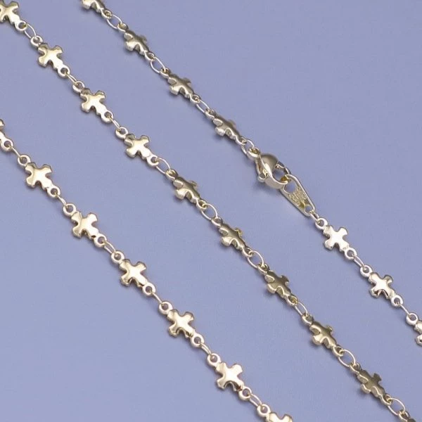 Řetízek z chirurgické oceli je složený z křížků o velikosti 6x4mm. Povrchová úprava zlacení 14ker. v ČR v odstínu českého zlata. Bez niklu. Šířka 4mm Délka na výběr 40cm, 45cm, 50cm, 60cm. K řetízku nabízme také náramek. RZ051