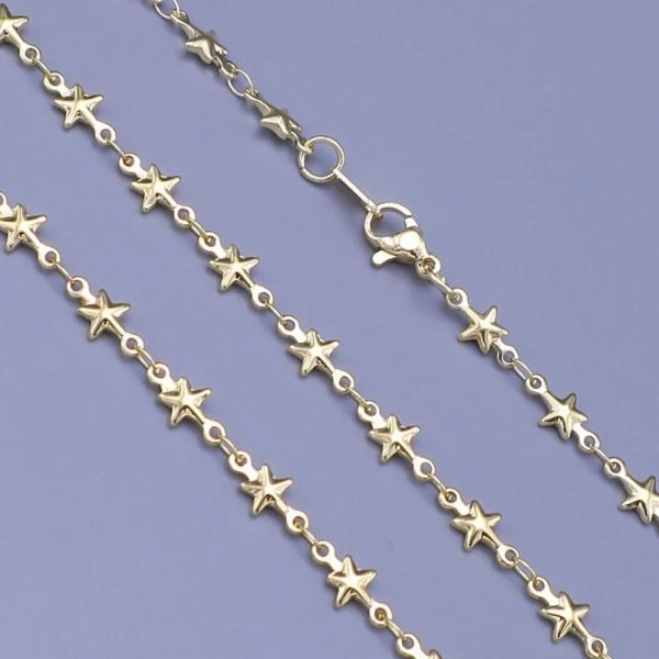 Řetízek z chirurgické oceli oboustranné hvězdy je povrchově upraven zlacením 14kar. bez niklu. Zlaceno v ČR v odstínu českého zlata. Šířka 5mm Délka na výběr od 40-45-50cm K řetízku nabízíme také náramek a náramek na kotník. RZ05