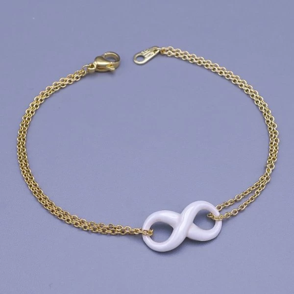 Náramek z chirurgické oceli se skládá s řetízků o šířce 1mm a keramickým symbolem infinity 20x10mm. Povrchová úprava zlacení 14kar. v ČR. Odstín českého zlata bez niklu. Délka na výběr od 16-17-18-19-20-21cm 39