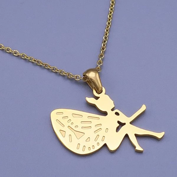 Krásný přívěsek z leštěné chirurgické oceli andělka je povrchově upraven zlacením. Velikost 20x17mm Přívěsek je zavěšen na zlaceném řetízku z ch. oceli, který si můžete vybrat z šířek 1,2mm, 2mm. Délka na výběr od 40-45-50cm 645
