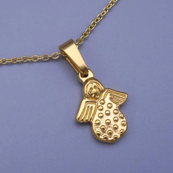 Přívěsek z leštěné chirurgické celi andělíček je povrchově upraven zlacením. Velikost 18x13mm Přívěsek je zavěšen na řetízku, který si můžete vybrat z šířek 1,2mm, 2mm. Délka na výběr od 40-45-50cm 1127