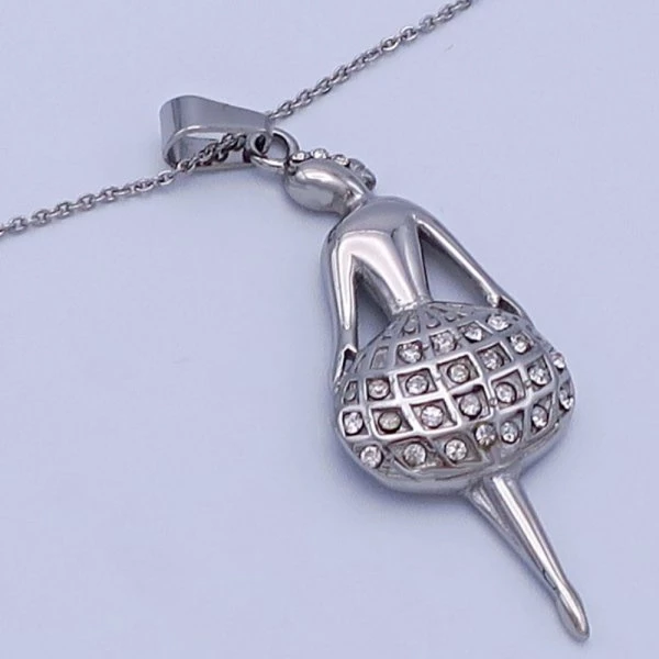 Přívěsek z leštěné chirurgické oceli baletka je zdobená čirými zirkony. Velikost 50x20mm Přívěsek je zavěšen na řetízku z chirurgické oceli o šířce 2mm, který si můžete vybrat z délek od 40-45-50-55-60-65-70cm 283