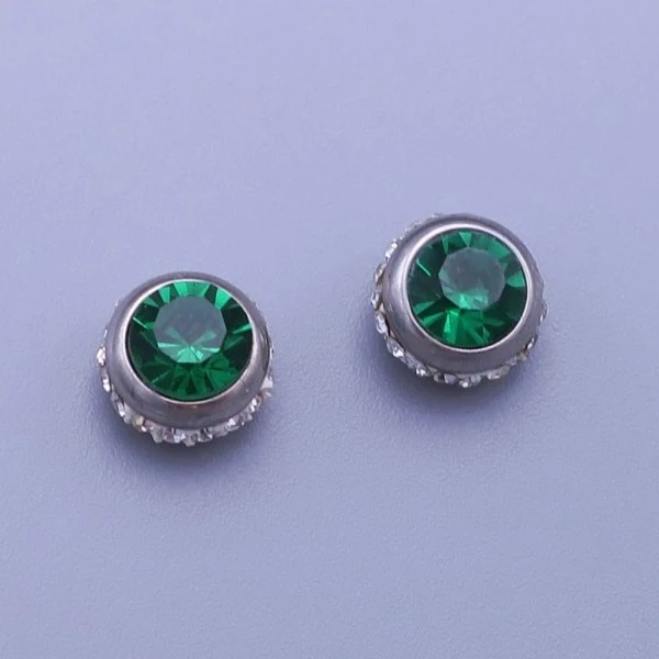 Náušnice z leštěné chirurgické oceli zdobí zirkon v zelené barvě ( emarald ) Po celém obvodu náušnic jsou vsazeny čiré zirkony. Velikost 6mm Puzetové zapínání. 1124