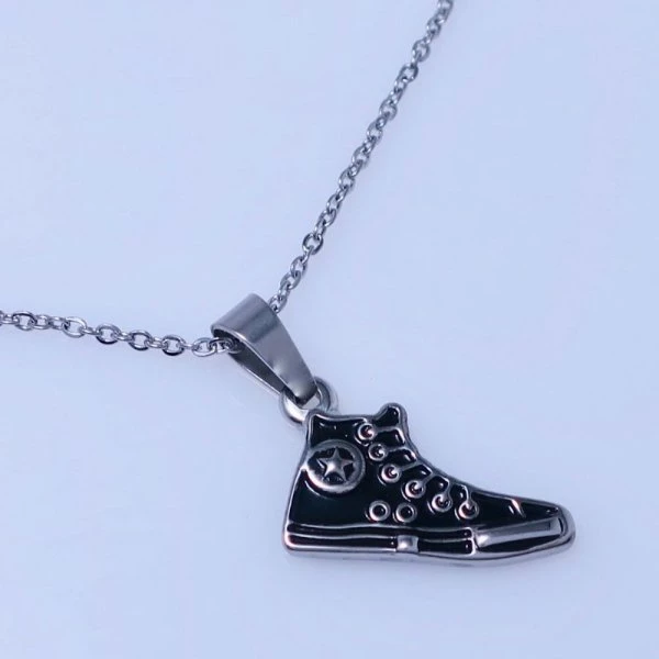 Přívěsek z leštěné chirurgické oceli teniska je zdobená černou lesklou výplní. Velikost 20x10mm Přívěsek je zavěšen na řetízku z chirurgické oceli o šířce 2mm. Délka na výběr od 40-45-50-55-60-65-70cm Chirurgická ocel je vhodná pro alergiky na běžné kovy. 154