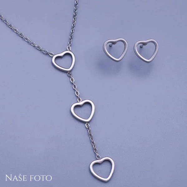Souprava z chirurgické oceli, srdcová, náušnice s přívěskem. Srdíčka velikost: 9x9mm Délka přívěsku: 53mm Délka řetízku: délka je nastavitelná od 45cm do 50cm Náušnice mají zapínání na puzetu. 22088