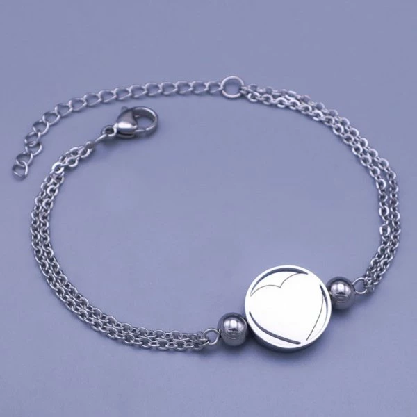 Náramek z chirurgické oceli, srdce s kuličky. Srdíčko je v kolečku o průměru 15mm, je zdobeno po stranách kuličkami o průměru 6mm. Náramek má nastavitelnou délku od 17cm do 22,5cm, s šírkou 3mm. 22082