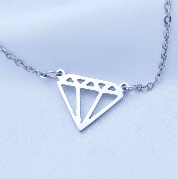 Přívěsek z leštěné chirurgické oceli diamant. Velikost 15x12mm. Přívěsek je zavěšen na řetízku z chirurgické oceli o šířce 1,2mm. Délka nastavitelná od 40cm do 46cm. 000070