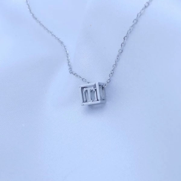 Přívěsek z leštěné chirurgické oceli 3D kostička je z každé strany označena písmenkem. Výběr písmen : A, B, D, E, H, J, K, L, M, N, P, R, S, T, V, Z Velikost kostičky 6mm Přívěsek je zavěšen na řetízku z chirurgické oceli o šířce 1mm. Délka nastavitelná od 47cm do 52cm. 000051