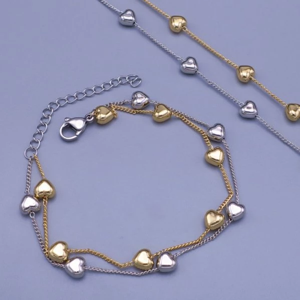 Luxusní srdíčková souprava z chirurgické oceli, kombinované se zlacení. Velikost srdíčka 5x5mm. Délka náramku je nastavitelná od 17cm do 22cm. Délka řetízku: kratší - 41cm, delší - 49cm. Délku lze prodloužit nastavovacím řetízkem o 5cm. Šperky z chirurgické oceli jsou vhodné pro alergiky na běžné kovy. 220015