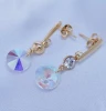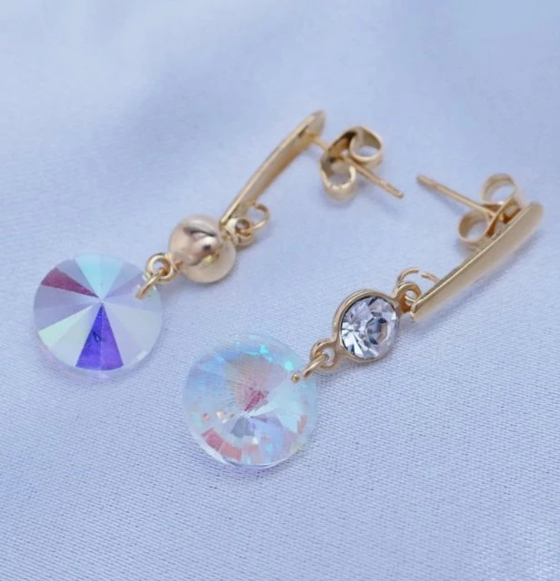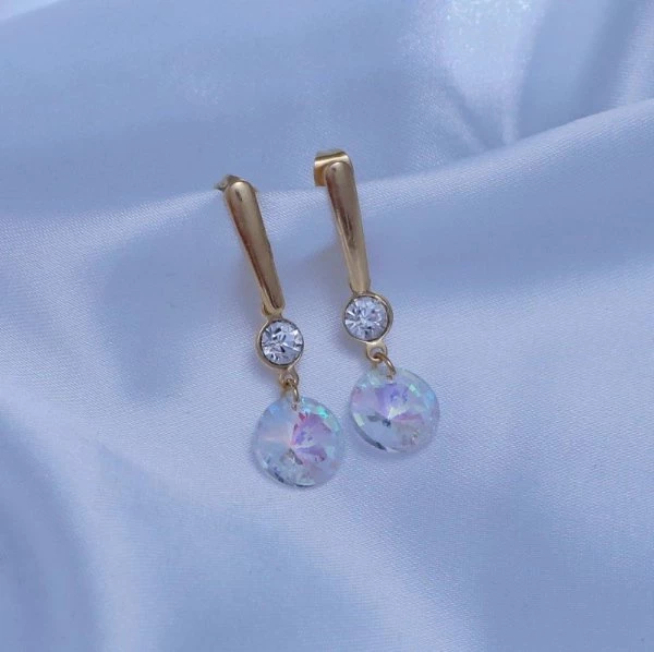 Náušnice z chirurgické oceli, jsou povrchově upraveny zlacením 14kar. Na puzetovém zapínání o velikosti 15x2,5mm, je uchycen zirkon 5mm čiré barvy a kamínek 10mm v barvě crystal AB ( měnící ) Celková délka náušnic se zapínáním : 33mm Chirurgická ocel je vhodná pro alergiky na běžné kovy. NA016
