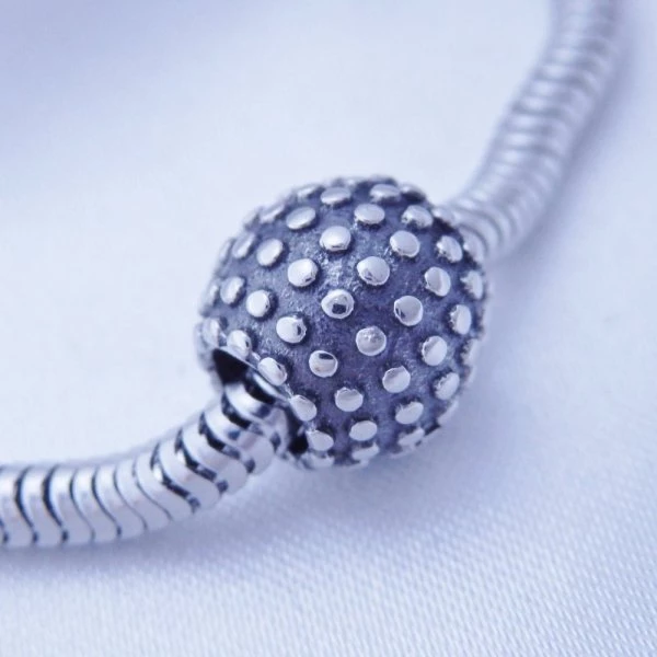 Korálek z chirurgické oceli je zdoben puntíky po celém svém obvodu. Průměr: 10mm Šířka: 9mm Vnitřní průměr: 4,5mm K035