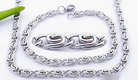 Souprava z chirurgické oceli. Set řetízku a náramku, vysoký lesk. Délka řetízku 60 cm, délka náramku 21 cm, šířka 1.5 mm. Kód produktu 20622