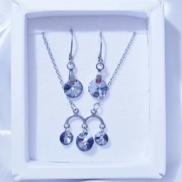 Souprava z chirurgické oceli , je složená z koleček Swarovski 6mm , 8mm v barvě Light Chrom ( stříbrošedá ) Náušnice kolečka Swarovski 8mm jsou uchycena na zapínání z chirurgické oceli na klapku . Celková délka náušnic se zapínáním 25mm . Přívěsek složen z koleček 6mm , 8mm o velikosti 20x15mm je zavěšen na řetízku z chirurgické oceli o šířce 1,2mm. Délka řetízku na výběr od 40-45-50cm Souprava je uložená v originál krabičce . 486