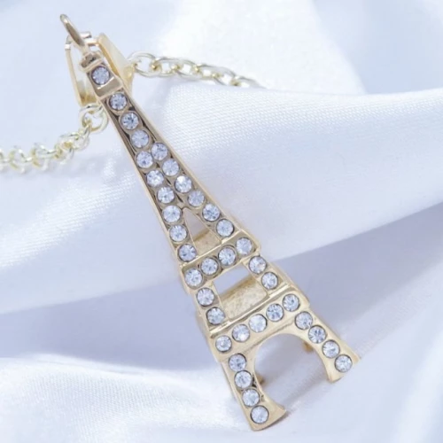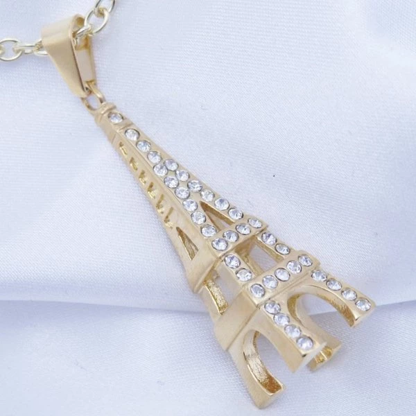 Přívěsek z chirurgické oceli Eiffelova věž zdobená čirými zirkony o velikosti 45x13mm , je povrchově upravena zlacením . Je zavěšena na zlaceném řetízku z chirurgické oceli o šířce 3mm v délce 60cm Chirurgická ocel je vhodná pro alergiky na běžné kovy . PZ012
