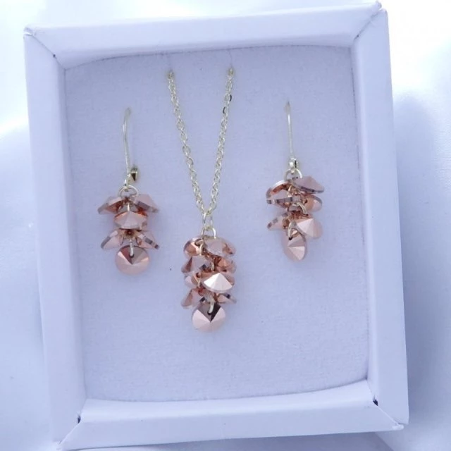 Krásná jemná souprava složená z koleček Swarovski o velikosti 6mm do tvaru hroznu . Krásná nová barvička : Gold rose Náušnice jsou složeny ze sedmi koleček a jsou zavěšeny na zlaceném zapínání z chirurgické oceli na klapku . Celková délka náušnic 30mm Přívěsek o délce 20mm je složen z devíti koleček a je zavěšen na zlaceném řetízku z chirurgické oceli o šířce 2mm . Délka řetízku na výběr od 40-45-50cm Souprava je uložená v krabičce . S65