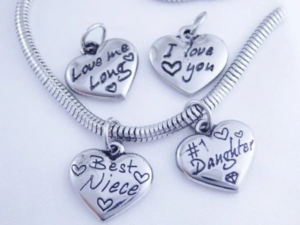 Přívěsek na náramek z chirurgické oceli oboustranné srdíčko je zdobeno černým gravírováním. Velikost : 15mm Návlekové kolečko - 6mm Můžete si vybrat ze čtyř typů : Love me long , 1 Daughter , I Love you , Best Niece. Cena za kus . Náramek není součástí . Chirurgická ocel je vhodná pro alergiky na běžné kovy . Kód K38 V nabídce náramek v ceně 120kč
