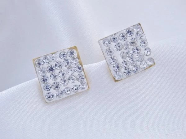 Náušnice z chirurgické oceli čtverečky jsou zdobené zirkony v barvě crystal ( čirá ) a povrchově upraveny zlacením . Náušničky jsou ve slevě z důvodu ne úplně pravidelného usazení zirkonů. Při nošení ale tato drobná vada není vůbec vidět . Jsou krásně třpytivé a nepravidelnost se ztratí :o)) Velikost : 9mm Zapínání na puzetu . Chirurgická ocel je vhodná pro alergiky na běžné kovy .