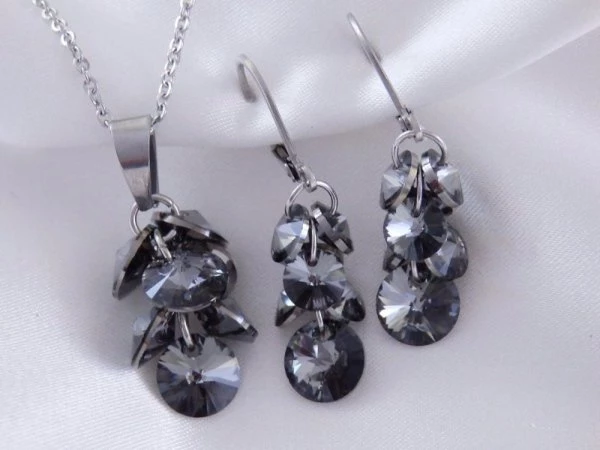 Krásná souprava z chirurgické oceli je složená z koleček Swarovski do tvaru hroznu v barvě Silver Night ( šedočerná ). Náušnice kolečka 6mm a 8mm jsou vytvořeny do tvaru hroznu . Celková délka náušnic se zapínáním : 33mm Přívěsek se skládá z koleček 8mm . Délka přívěsku 30mm . K soupravě je řetízek z chirurgické oceli 3mm . Délka na výběr od 40-45-50-55-60-65-70cm Souprava Je uložená v orirginál dárkové krabičce . Chirurgická ocel je vhodná pro alergiky na běžné kovy. 00054