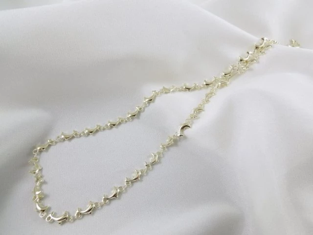 Dámský řetízek z chirurgické oceli Delfín je povrchově upravený zlacením 14Kar.Síla zlacení 3mikrony. Zlacení je opatřeno lakem ,který jej chrání a prodlužuje krásný lesklý vzhled. Délka : Na výběr ze dvou variant 45cm ,50cm Velikost delfínů: 12x5mm RZ014