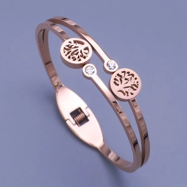Náramek z leštěné chirugické oceli je zdobený syboly strom života o velikosti 10mm a čirými zirkony 3mm. Náramek je vyroben ve tvaru oválku, díky tomu krásně sedí na zápěstí. Nasazení na pružinu. Spodní šířka náramku je 3mm, a v pružovém uchycení 11mm. Vrchní šířka je 4mm - 13mm. Náramek je vhodný na velikost zápěstí 15cm - 16,5cm Povrchová úprava zlacení v odstínu gold rose ( růžové zlacení ) 22523