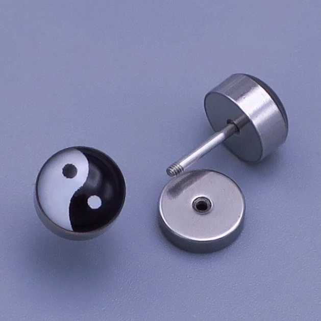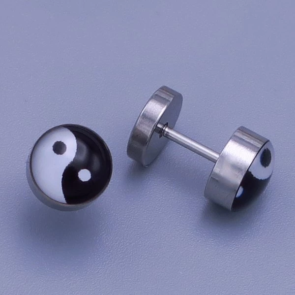 Pánské piercingové náušnice s motivem Jing a Jang. Jsou z leštěné chirurgické oceli, která je vhodná pro alergiky na běžné kovy. Velikost symbolu je 8mm. Šířka symbolu je 3mm. Místo mezi dvěma symboly je 7mm. Cena je za jeden kus. 22479