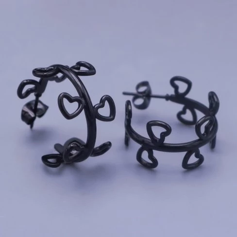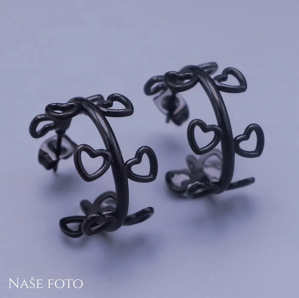 Náušnice z chirurgické oceli kroužky se srdíčky, jsou povrchově upraveny černým rutheniem.