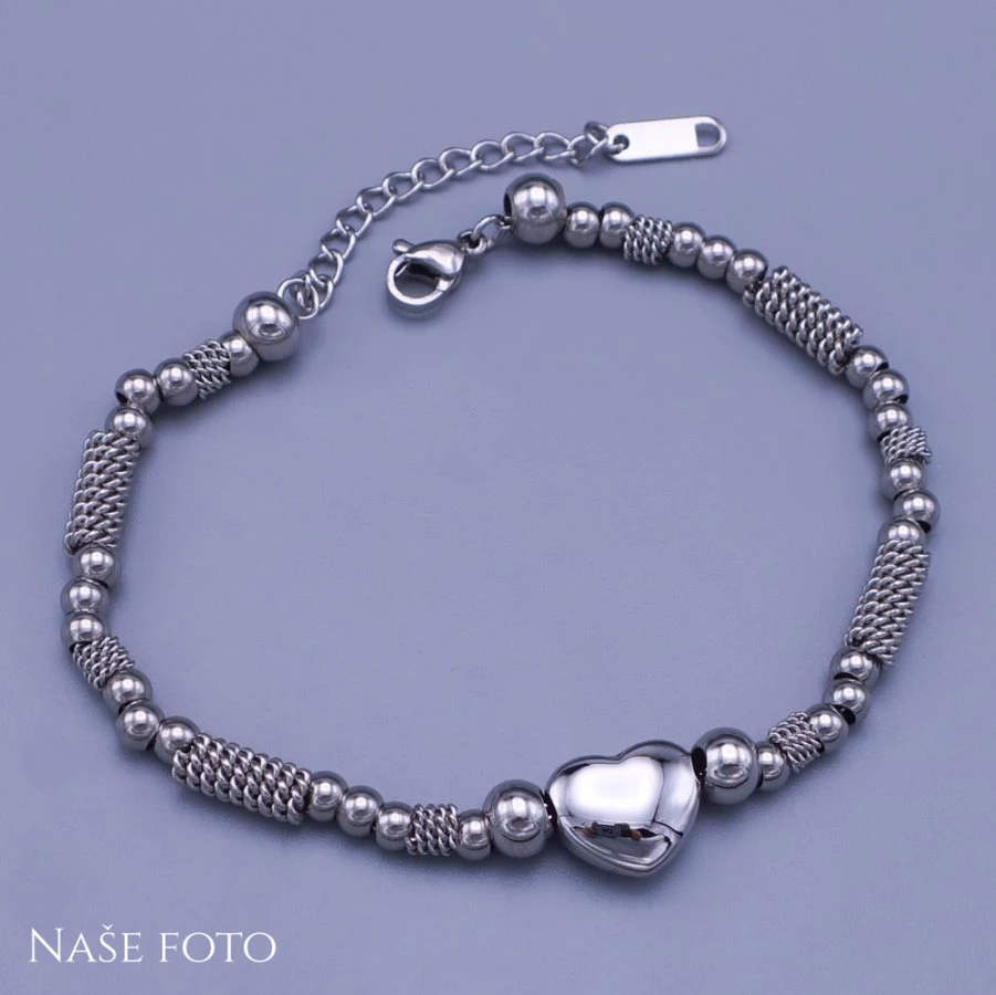 Stylový dámský náramek z chirurgické oceli s korálky. Náramek je zdoben kuličkami a jeho dominantou je srdíčkový korálek umístěný ve středové části. Tento výrazný, přesto decentní náramek je vhodný pro ženy všech věkových kategoríí. Je skvělým doplňkem elegantních, ale i lehce sportovnějších outfitů.