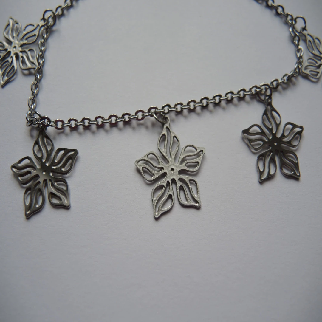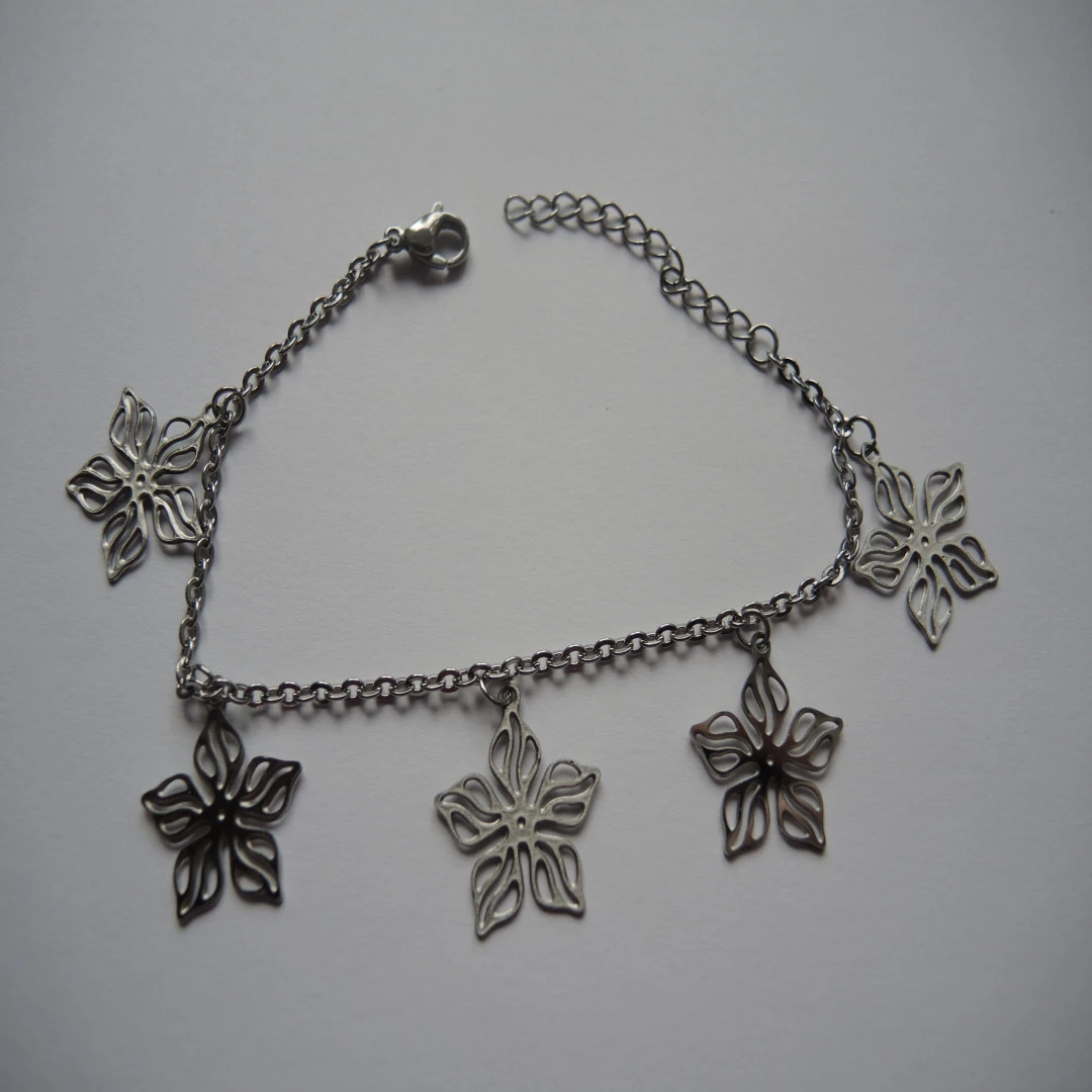 Náramek z leštěné chirurgiské oceli zdobený přívěsky kytiček