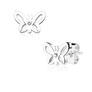 Ocelové náušnice - motýlci zdobené zirkonkem Náušnice jsou vyrobeny z chirurgické oceli 316L Parametry materiál chirurgická ocel povrchová úprava lesklá typ uzávěru puzeta Rozměry 9x6mm