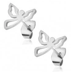 Náušnice z chirurgické oceli v lesklém stříbrném vyhotovení mají tvar kontury anděla s křídly. Zapínání je puzetové. Rozměry náušnic: 9 x 10 mm