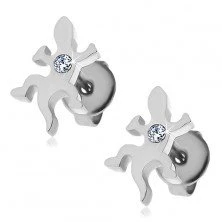 Náušnice z chirurgické oceli v lesklém provedení, ve tvaru lezoucí ještěrky se zirkonovým kamínkem uprostřed. Náušnice se zapínají na puzetku Rozměry: 8 x 12 mm