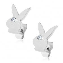 Ocelové náušnice mají stříbrný odstín a tvoří je hlava zajíčka Playboy se vsazeným zirkonovým očkem čiré barvy. Náušnice se zapínají na puzetku Rozměry náušnic: 6 x 12 mm