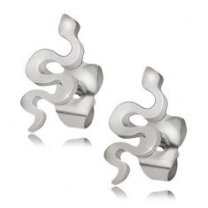Lesklé ocelové náušnice ve stříbrném provedení mají hlavičku ve tvaru plazícího se hada. Zapínání je puzetové. Rozměry: 6 x 12 mm