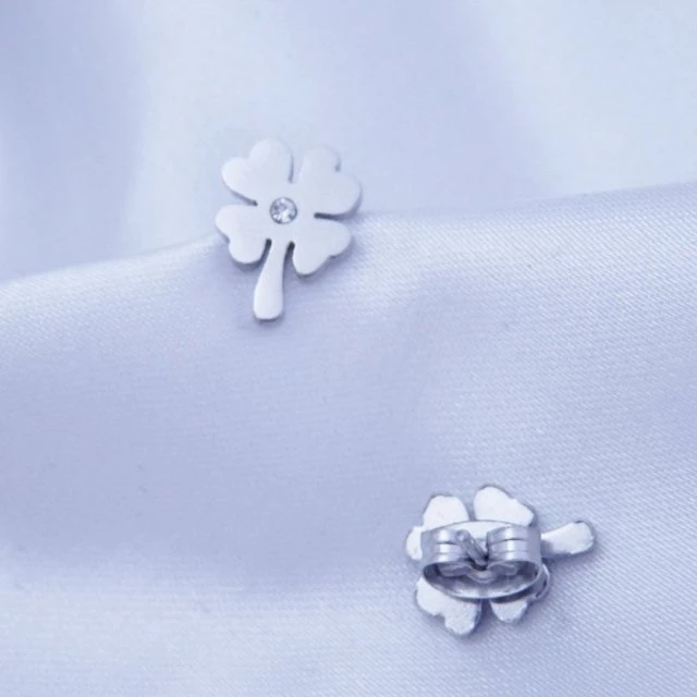Náušnice z leštěné chirurgické oceli čtyřlístky zdobí zirkon v čiré barvě , Velikost : 8x11mm Chirurgická ocel je vhodná pro alergiky na běžné kovy . 509