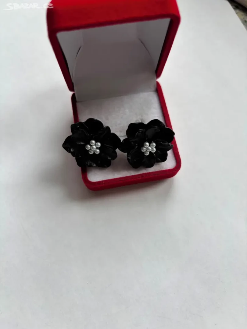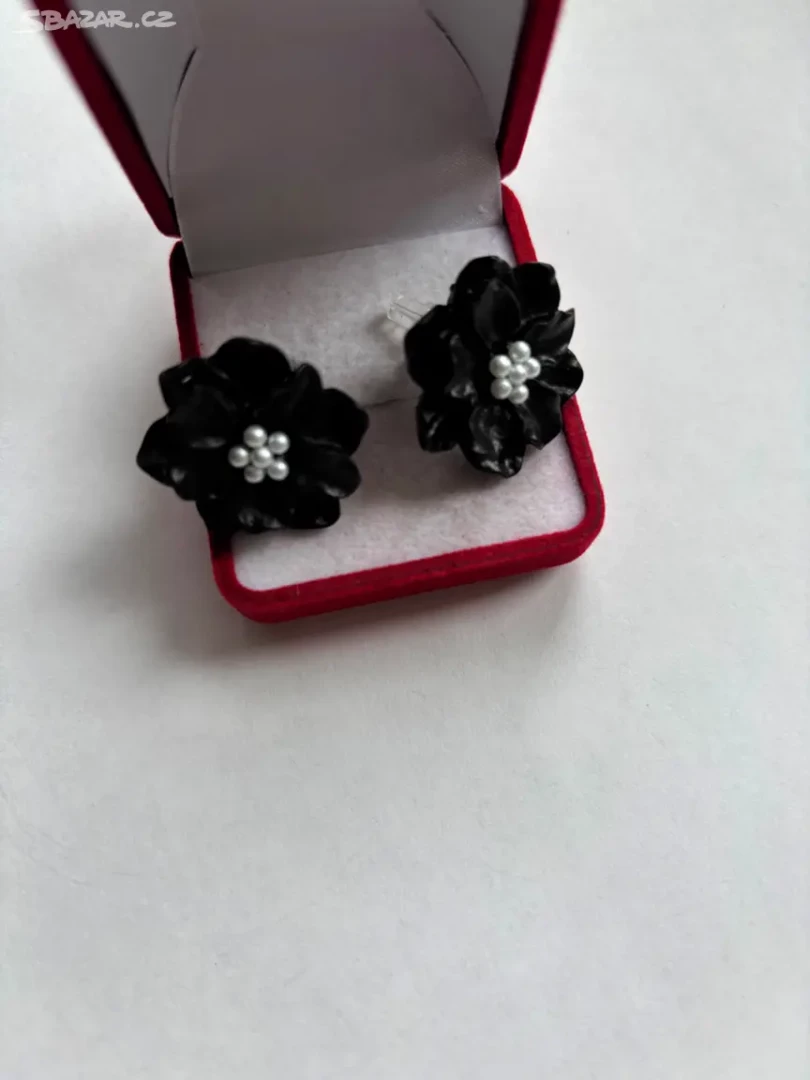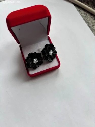 Krásné náušnice ve tvaru kytiček v černé barvě zdobené bílými perličkami