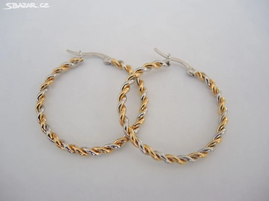 Ocelové náušnice tvaru kruhu, splétané linie ve zlatém a stříbrném odstínu, francouzský zámek.