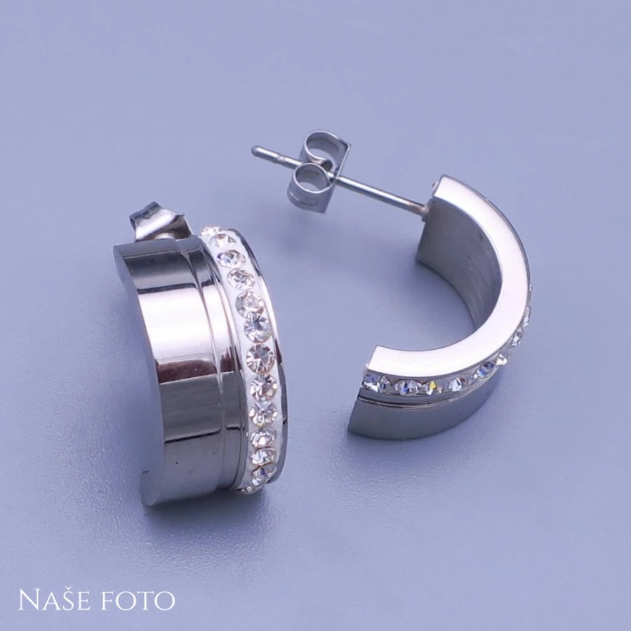 Luxusní dámské náušnice z chirurgické oceli - půlkroužky zdobené zářivými čirými kamínky. Náušnice jsou střední velikosti a skvěle se hodí k elegantním outfitům. Jsou vyrobeny z chirurgické oceli, která je vhodná také pro osoby s alergiemi na běžné na kovy.