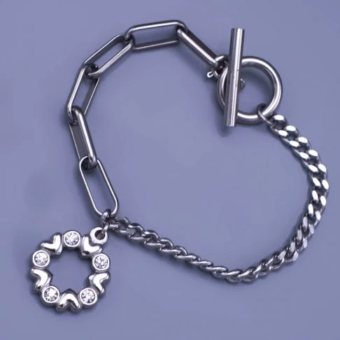Stylový dámský náramek z chirurgické oceli s přívěskem. Náramek je tvořen kombinací pancerového a řetězovitého vzoru. Dominantou náramku je zářivý přívěsek , který mu dodává luxusní vzhled. Přívěsek je kruhový, tvořený spojením srdíček a čirých zářivých kamínků. Zapínání náramku je velice jednoduché a pohodlné a funguje na principu prostrčení tyčinky koncovým kolečkem. Tento náramek skvěle doplní Váš elegantní outfit na plesy, večírky a jiné speciální události.