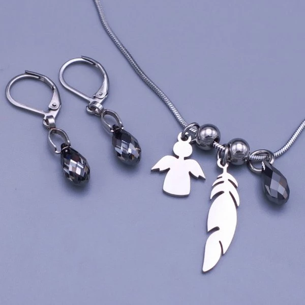 Nádhérná souprava řetízku a náušnic z chirurgické oceli s komponenty Swarovski Crystal. Tato souprava je složena z hladkého kulatého řetízku zdobeného přívěskem anděla, pěříčka, kamínkem Swarovski ve tvaru kapky a dvěma ocelovými kuličkami. Řetízek je velmi jemný, lehký a je tedy vhodný na každodenní nošení. Náušnice v soupravě jsou sladěny s příveskem. Jsou zdobeny krystaly světoznámé luxusní značky Swarovski. Délka řetízku: 45cm Rozměry přívěsku (peříčko): 25x6mm Rozměry přívěsku, kamínku náušnic (Swarovski kamínky): 10x6mm Rozměry přívěsku (anděl):15x12 Zapínání náušnic: pohodlné na klapku 7709