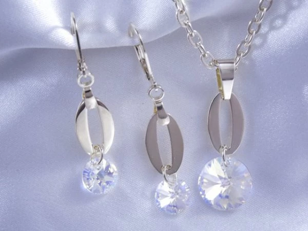 Krásná elegantní souprava z chirurgické oceli se Swarovski components v barvě Crystal AB ( měnící ) Náušnice : Swarovski rivoli o velikosti 8mm jsou zavěšeny na oválku o velikosti 15x8mm . Vše je uchyceno na zapínání z chirurgické oceli na klapku. Celková délka náušnic se zapínáním : 40mm Přívěsek : Swarovski rivoli o velikosti 12mm je uchycen na oválku o velikosti 15x8mm . Celková délka přívěsku : 35mm. Přívěsek je zavěšen na řetízku z chirurgické oceli o šířce 3mm a délce kterou si můžete vybrat z variant 45cm , 50 cm . Souprava je povrchově upravená zlacením 14kar. Zlaceno v České republice . Souprava je uložená v originál dárkové krabičce. SZ020