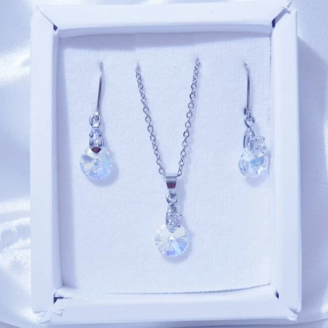 Souprava z chirurgické oceli je složená z krystalů Swarovski koleček o velikosti 8mm v barvě crystal AB ( měnící ) . Náušnice : kolečka jsou uchyceny na zapínání z chirurgické oceli zdobené čirým zirkonem se zapínáním na klapku . Celková délka se zapínáním : 25mm Přívěsek 8m je zavěšen na řetízku z chirurgické oceli v šířce 2mm Délka na výběr od 40-45-50-55-60cm Souprava je také vhodná pro děti od 6 let Uložená v originál krabičce .