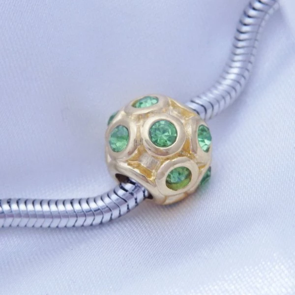 Korálek z chirurgické oceli zlacený se zirkony zelená. Zirkony jsou po celém obvodu korálku, barva zelená. Průměr: 12mm Šířka: 10mm Vnitřní průměr: 5mm K026